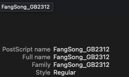 If the languages for pages.app is set to Chinese, then Family name changes from SimSun to 宋体.
