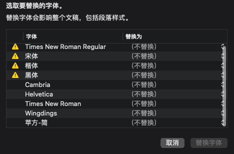 Still it reminds that Fonts are missing despite I have “宋体” in the menu.